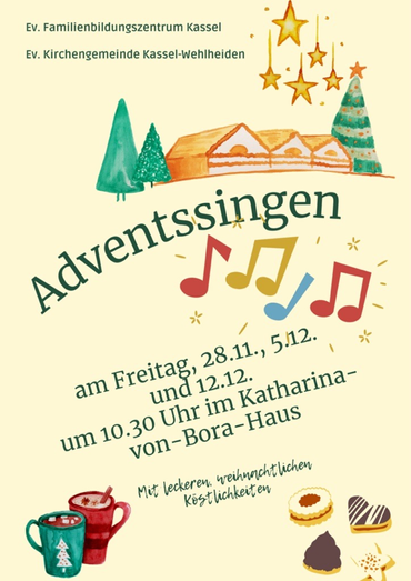 Das Evangelische Familienbildungszentrum Kassel und die Evangelische Kirchengemeinde Kassel-Wehlheiden laden herzlich zum Adventssingen ein.