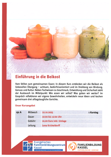 Vom Stillen zum gemeinsamen Essen: In diesem Kurs entdecken wir die Beikost als liebevollen Übergang – achtsam, bedürfnisorientiert und im Dreiklang von Bindung, Genuss und Kultur. Neben Fachwissen zu Geschmack, Entwicklung und Sicherheit steht der Austausch im Mittelpunkt: Wie essen wir selbst? Was geben wir weiter? Im Gespräch reflektieren wir eigene Gewohnheiten, entwickeln neue Ideen und kochen gemeinsam drei alltagstaugliche Gerichte.