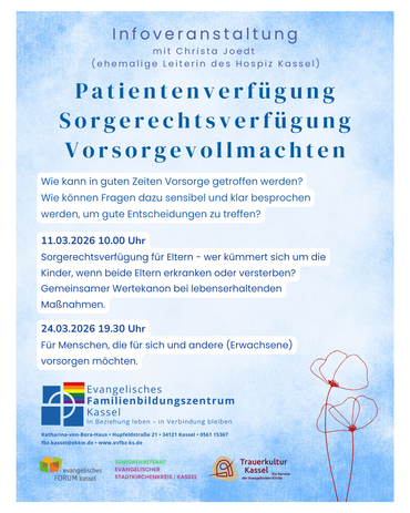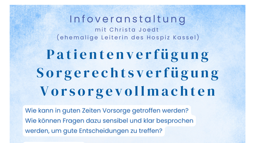 In dieser Infoveranstaltung mit Christa Joedt (ehemalige Leiterin des Hospiz Kassel) erhalten Sie einen verständlichen Einblick in die Themen Patientenverfügung und Vorsorgevollmacht. Sie erfahren, wie Sie in guten Zeiten wichtige Entscheidungen für sich und nahestehende Menschen treffen können – klar, rechtlich sicher und im Einklang mit Ihren persönlichen Werten.