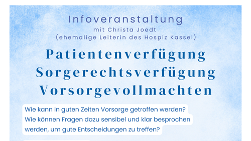 Was passiert mit den Kindern, wenn beide Eltern schwer erkranken oder versterben? Diese Veranstaltung richtet sich an Eltern, die für den Ernstfall vorsorgen möchten. Gemeinsam mit Christa Joedt (ehemalige Leiterin des Hospiz Kassel) sprechen wir über die Sorgerechtsverfügung und darüber, wie Eltern ihre Wertvorstellungen für medizinische Maßnahmen in schwierigen Situationen festhalten können.